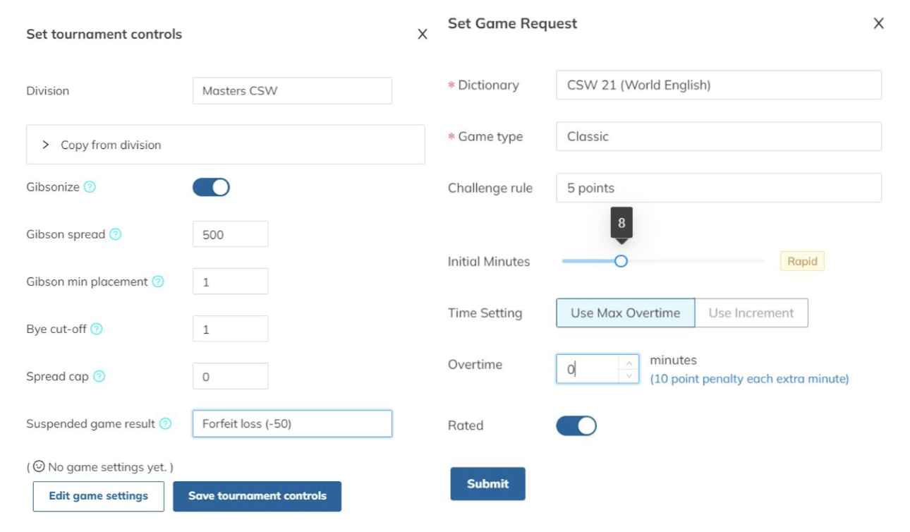 - Once you have added a division, you need to click SET TOURNAMENT CONTROLS and keep the below settings. I don’t want to discuss the technical aspects or discuss whether Gibsonization be turned off or not; these things you can always experiment on with at a later stage. You can hover over to the blue tick to get a general understanding. Click on Edit game settings for lexicon and timer. Once you submit you can Save tournament controls.