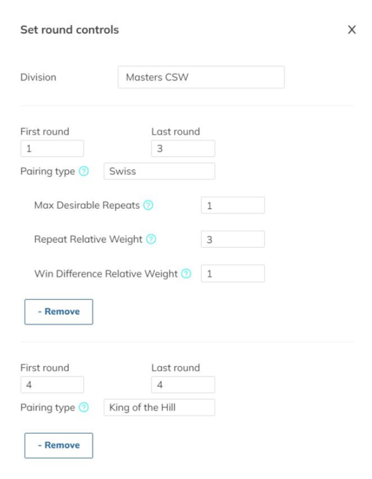 - Once tournament controls are set, you have to set the rounds settings by clicking on SET ROUND CONTROLS. If you want to do five rounds for your tournament you can keep Round One as Random, Round Two to Four as SWISS and the last Round should always be King of the Hill, or you can keep Round One to Four as Swiss and last round KOH. I do a four rounds tournament and below are the settings that have worked smoothly for me so far.