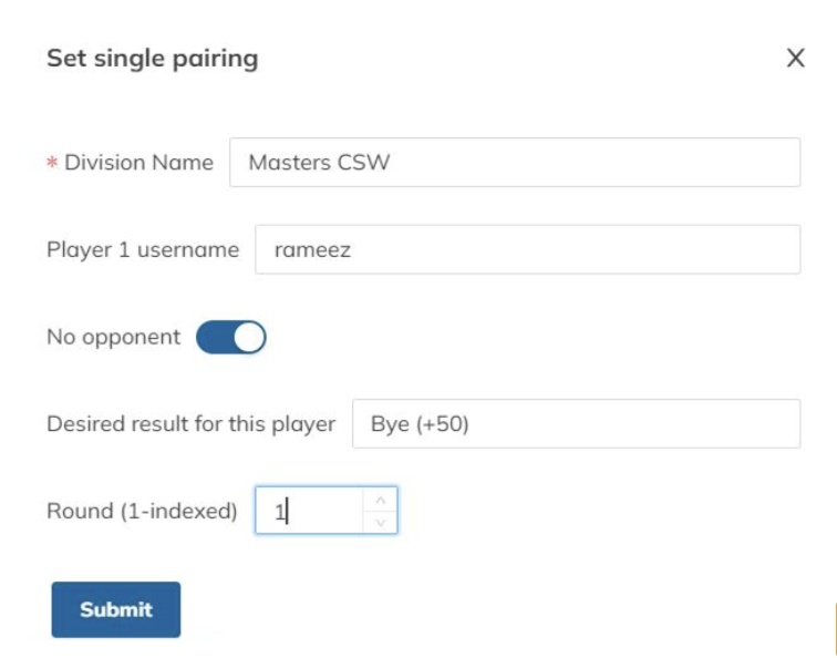If you have added nine players before round one and started the tournament, one of them will surely get the bye for round one (Rameez in below example) OR if for instance two players joined and both wished to participate after round one was started by director, they will get automatic losses as forfeit for round one. So, to fix both cases, all you have to do is to click SET SINGLE PAIRING and select the desired result. Game against byes should always be counted as a win with a margin of 50 points.