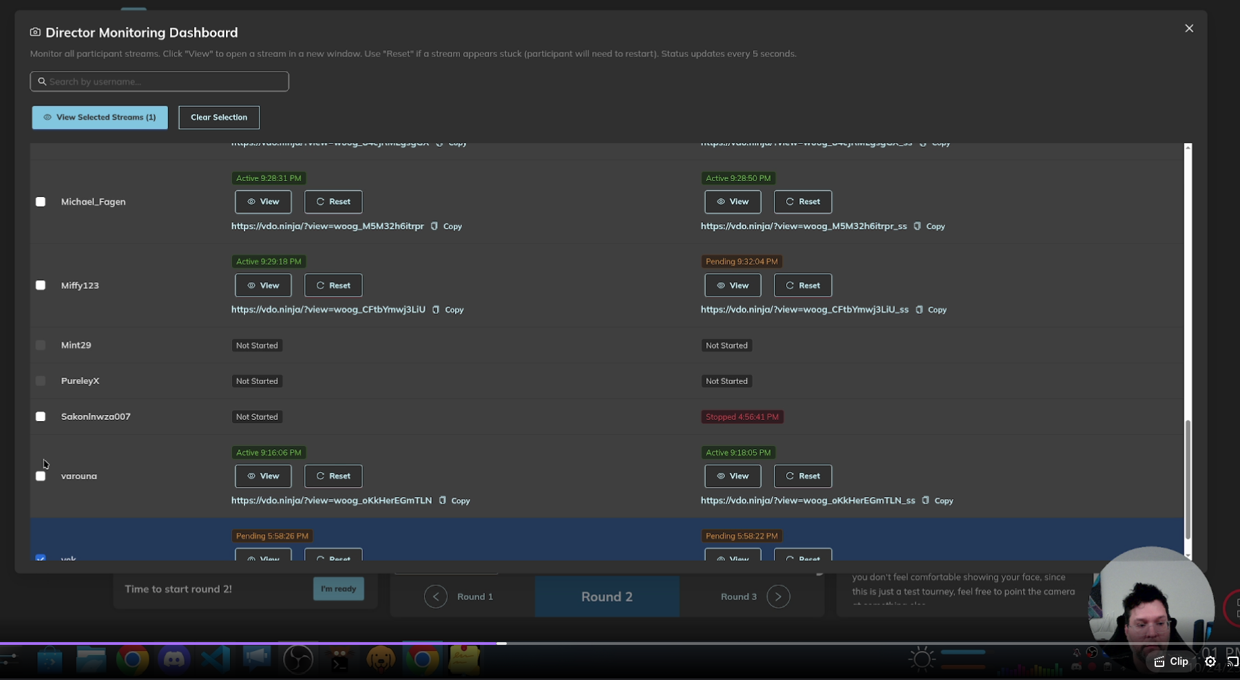 We use the vdo.ninja API and webhooks to determine when a stream has started or stopped. This directly updates a player’s streaming widget; this is a small floating widget on the bottom right of your screen during a tournament. If it’s not green, it means your stream might not be working.